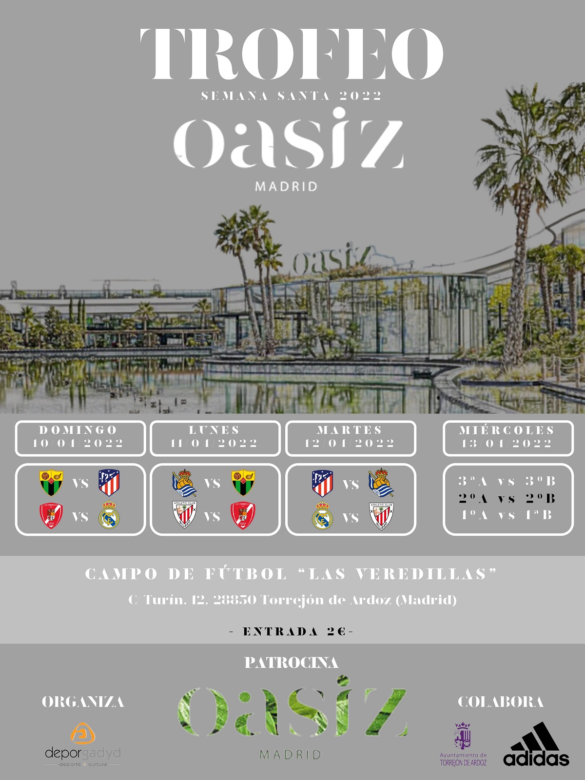 Torrejón de Ardoz será una de las ciudades de referencia en el fútbol de base durante esta Semana Santa. Del 10 al 13 de abril, el Campo de Fútbol Municipal Las Veredillas, acogerá el “Trofeo Oasiz” en el que participarán algunos de los mejores equipos de nuestro país de categoría infantil como son el Real Madrid, Atlético de Madrid, Athletic de Bilbao y Real Sociedad. Completan el cartel dos de las mejores canteras de la Comunidad de Madrid, con son la AD Torrejón CF y el Periso CF.